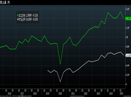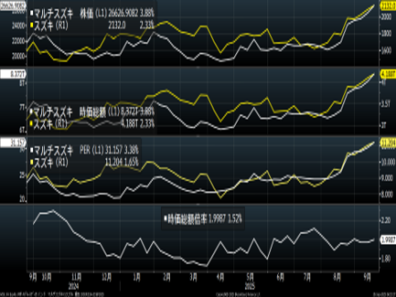 マルチスズキが史上最高値を更新。マルチスズキの売上高はスズキの約45%ですが、時価総額はスズキの約2倍の8.37兆円(スズキは4.18兆円)と、逆転現象が起きています。