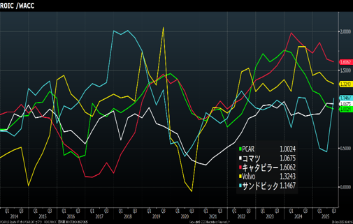 ROIC・WACCレシオは、キャタピラーが1.6倍、サンドビックが1.14倍、コマツは1.06倍。この比率は高いほど企業ほど投資家の期待を上回る利益を得ているという指数です。