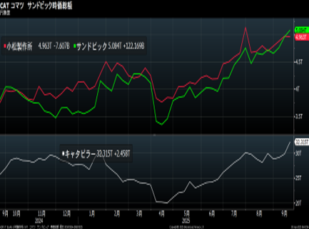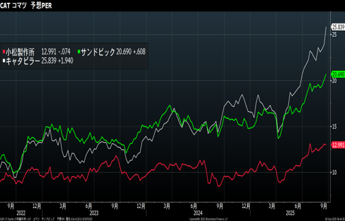 先週、建機メーカー世界1位のキャタピラーの株価が史上最高値を更新する中、世界第2位のコマツの時価総額(4.96兆円)が第10位のサンドビック(5.08兆円)に抜かされてしまいました。予想PERはキャタピラー25.8倍、サンドビックが20.69倍、コマツは13倍。
