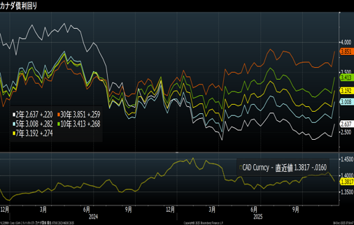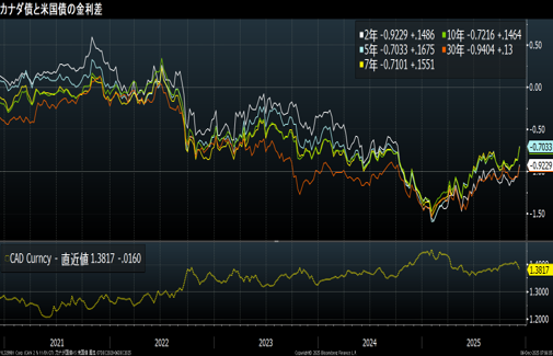 昨日、カナダ国債利回りが雇用統計を受け急騰。10年ゾーンまで18~20bp上昇。カナダは利上げに転じる可能性が高まっています。カナダ国債と米国債との金利スプレッドが縮小。CANドルに資金が流れています。今後のカナダドル投資は面白そうです。