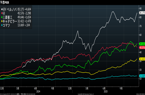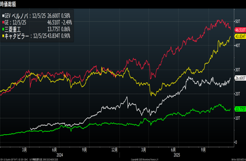 個別ではキャタピラーの株価が史上最高値を更新。時価総額は約43.83兆円です。キャタピラーが買われている要因はデータセンター向けの小型タービン需要の高まり。現在の予想PERは32倍と割高ですが、GEベルノバは85倍なのでまだまだ上昇余地があるかもしれません。