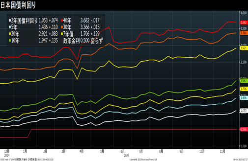 ついに2年債金利が1%乗せ。日銀の政策金利の上昇を織り込んでいます。日銀は12月の会合で25bpの利上げを実施するでしょう。利上げは来年以降も続き、4月には1%に引き上げられるでしょう。
