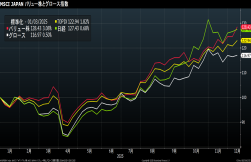 日本株は割安。外国人投資家の日本株買いで来年は円高株高の年となるでしょう。今週は日本のバリュー株が買われました。MSCIバリューインデックスは先週比3.08%高と、同グロースインデックスの0.5%を大きく上回っています。今週はパナソニック、本田技研、神戸鋼、住友金属鉱山などが急伸。この流れは来年も続きます。