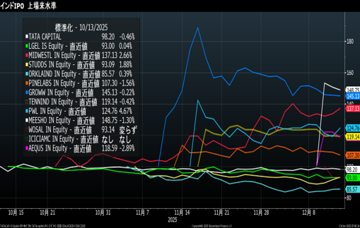インド市場から外国人投資家の資金は流出しているものの、IPO市場が活況です。今週は、ソフトバンク出資のミーショーが上場。初値は公募価格を45.2%上回る161.2ルピー。高値は177.55ルピーで、週末の終値は165.11ルピーと公募価格111ルピーを大きく上回りました。