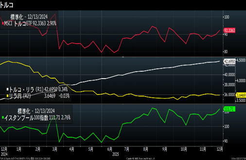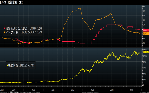 トルコ中銀が政策金利は1.5%引き下げ38.0%に。11月のインフレ率は31.07%(前日比