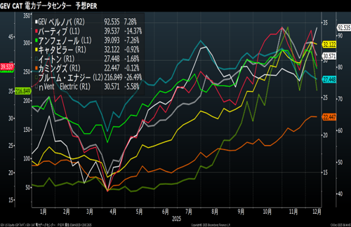 売られたとはいってもGEベルノバの騰落率(昨年末比)は104%、キャタピラーは64%です。予想PERはベルノバが92.53倍、キャタピラーは32.12倍。