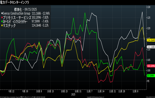 GEベルノバが4.6%、バーティブが9.7%、アンフェノールが9.7%、キャタピラーが4.4%、イートンが5.25%、ブルームエナジーは12.8%(前日比)、でインフラ関連では、イベリオスが12.9%、プリモリスSが7.8%、スターリングIは7.45%(前日比)でした。