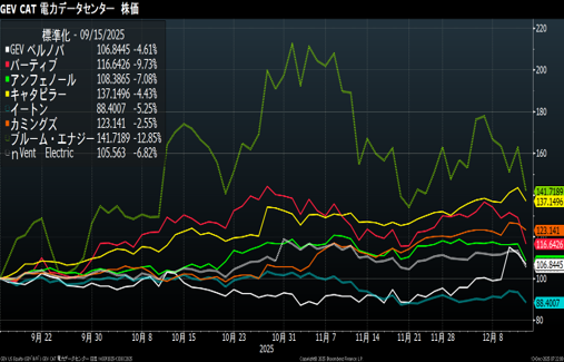 ちやほやされたAI関連が急落。昨日の米国市場ではAIの電力需要やデータセンターインフラ関連でいままでちやほやされていた、銘柄群が急落。下落率は電力需要関連銘柄では