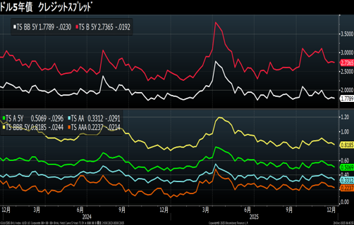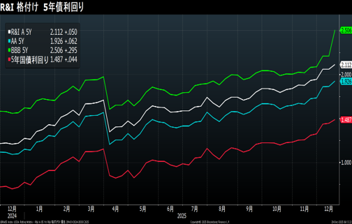 クレジット市場では、Tスプレッドの拡大が始まりました。利上げは債券価格のマイナス要因。投資家はより厚いスプレッドを望みます。図はR&Iの格付け別の利回り推移です。BBB格債の利回りが大きく上昇。Tスプレッドは25bp拡大。