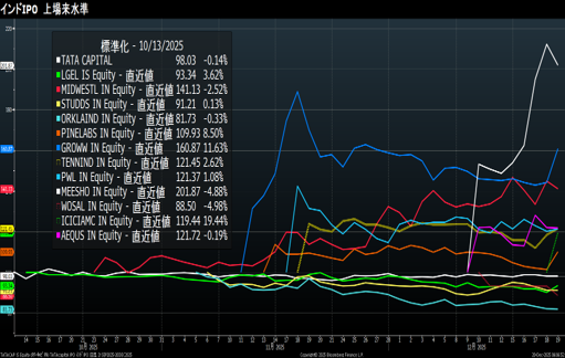 今年のインドファンドのパフォーマンスはマイナス。資金は流出しています。一方、本国ではIPO銘柄に資金が集中。ミーショーの週末の終値は224.08ルピーと、IPO価格111ルピーの倍、初値161.20ルピー比39%高い水準です