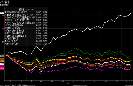 The Indian stock market has been disappointing this year. Major Indian mutual funds sold in Japan have performed poorly, with assets declining. The HSB Small Cap Open and Nomura Asia Series India have seen notable declines, with returns of around -11%.