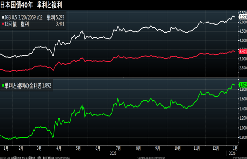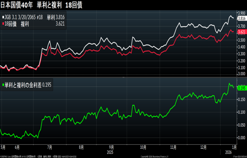 Japanese government bonds are traded at simple interest rates according to trading practices. The problem with ultra-long-term low-coupon bonds is the large discrepancy between simple and compound interest rates. The figure shows the trends in compound and simple interest rates for a 40-year, 0.5% coupon, 12th issue bond. The price is the same, but the simple interest rate is 5.29% while the compound interest rate is 3.40%. The term is different, but the 40-year 3.1% coupon.
