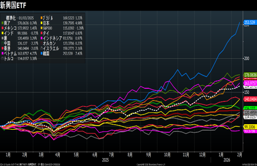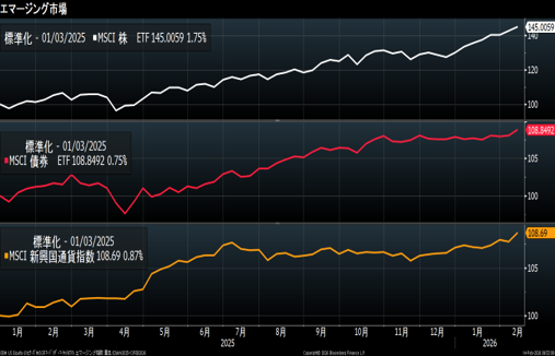 エマージング市場は、株、債券、通貨いずれも上昇。特に株式市場が好調。