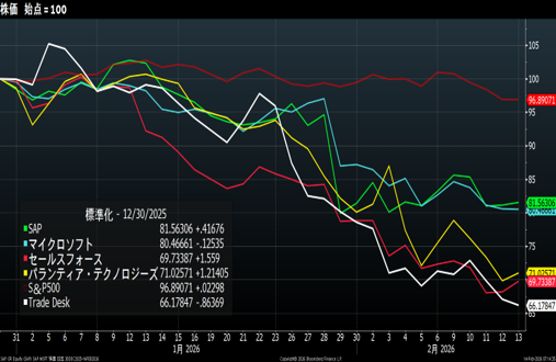 S&P500 は高水準で推移していますが、ソフト関連銘柄は低迷しています。マイクロソフトの株価は昨年末比マイナス19.5%、セールスフォースがマイナス30%、トレードデスクはマイナス33%。一方、キャタピラーやハネウェル、GEベルノバなどは史上高値を更新。